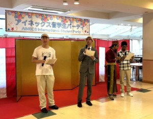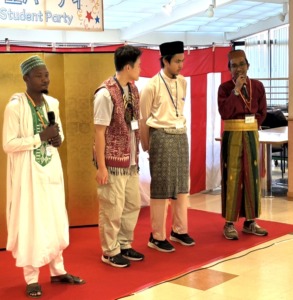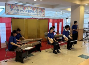 7月24日、愛媛大学で行われた「アイネックス(愛媛大学学生国際交流協力事業団)留学生パーティー」に出席しました。留学生たちが自国の民族衣装の説明をしたり、「上を向いて歩こう」の歌唱を披露したほか、和楽器の演奏もあり、和やかなひとときでした。