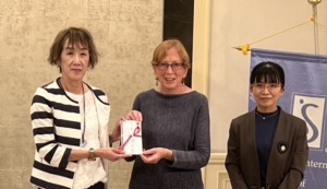 例会前に、ソロプチミスト日本財団『活動資金援助』応募者の「Yuiえひめ」代表ルース・バージン氏にクラブ賞を授与しました。ルースさんは愛媛大学で留学生関係の仕事をする傍ら、松山市などに暮らす外国人住民への支援活動を行っておられ、困りごとや今後の支援の在り方について卓話をいただきました。