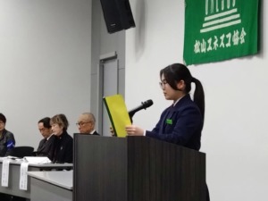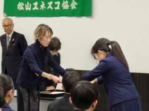 1月10日㈯愛媛新聞社1階で、松山ユネスコ協会「心の中に平和」作文コンクール表彰式があり、会長以下4名が出席しました。国際ソロプチミスト松山会長賞は、松山市立旭中学校2年大谷紗月さん。「自分の心の中に小さな平和を見つける力を持っていたい」と綴りました。私たちもそうありたいものです。 終了後、出席者で平和の鐘を鳴らし、争いや分断のない世界へ思いを新たにしました。
