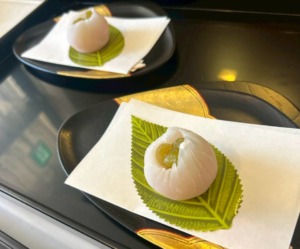 お菓子の銘は「早蕾(さつぼみ)」。春色の鶯豆をピンクの外郎生地で包み込んだ姿に「かわいい!」とお客様から好評をいただきました。